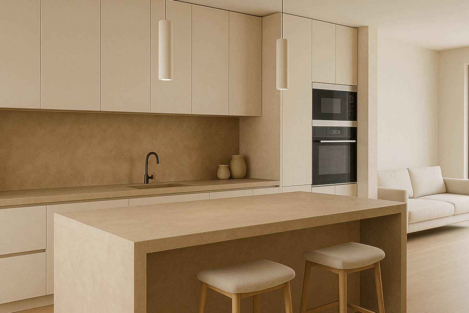 El microciment transforma les cuines en espais amplis, lluminosos i continus, aportant un disseny actual i minimalista.